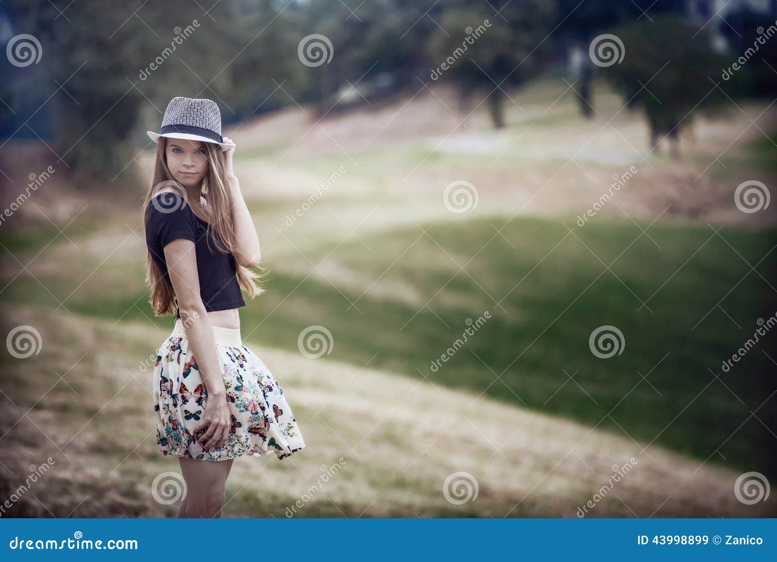 Schones Madchen 10 Jahre Alt In Einem Weissen Hut Der In Der Natur Stillsteht Stockbild Bild Von Madchen Schones