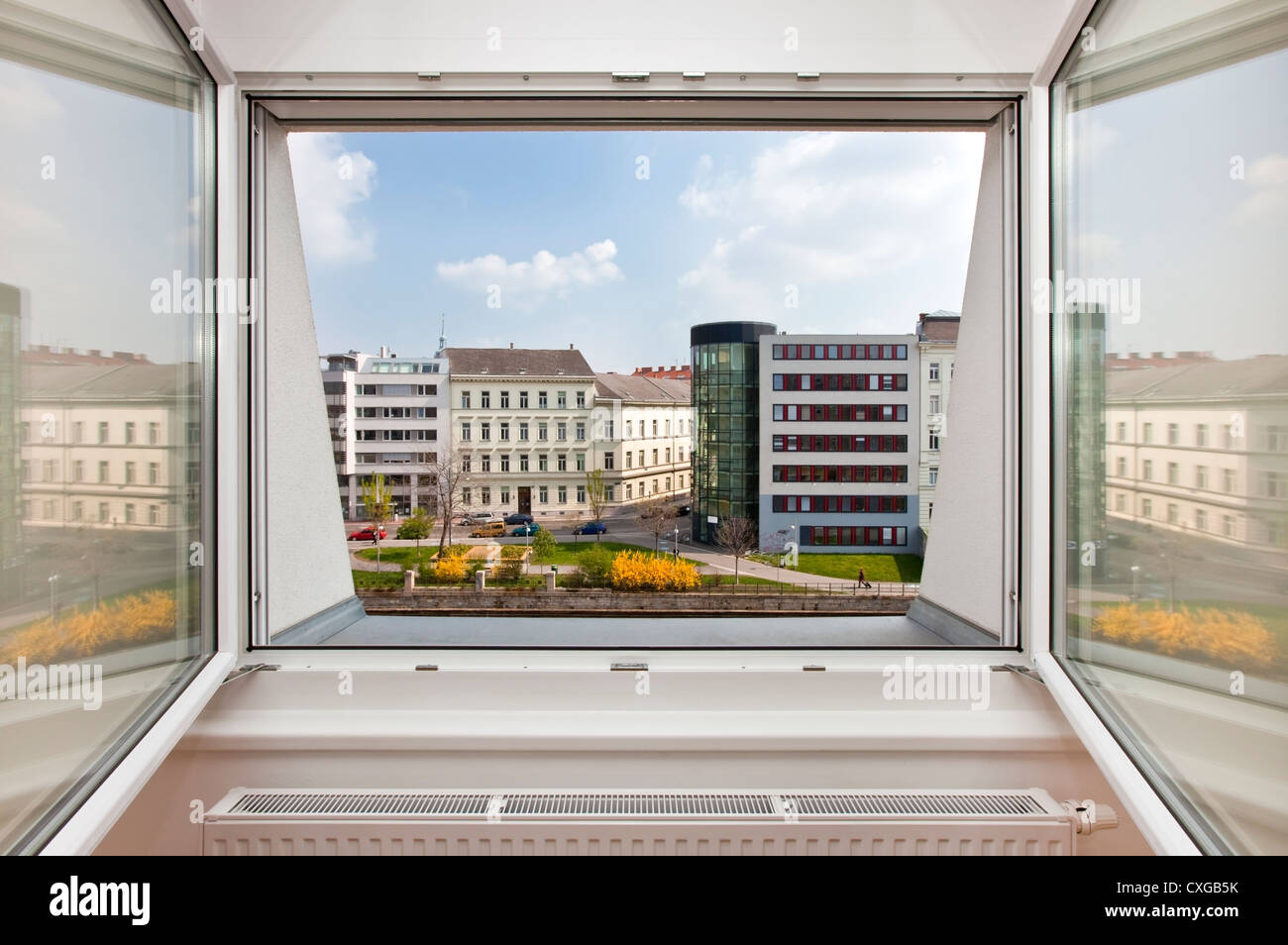 Outlook From An Apartment Window On Urban Setting Stock Photo Alamy