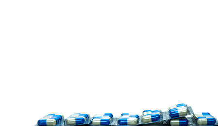 Blau Weisse Kapselpillen In Der Blisterpackung Lokalisiert Auf Weissem Hintergrund Mit Kopienraum Fur Text Antibiotika Resistenz Und Antimikrobieller Drogenkonsum Mit Vernunftigem Konzept Globale Gesundheitsversorgung Lizenzfreie Fotos Bilder Und