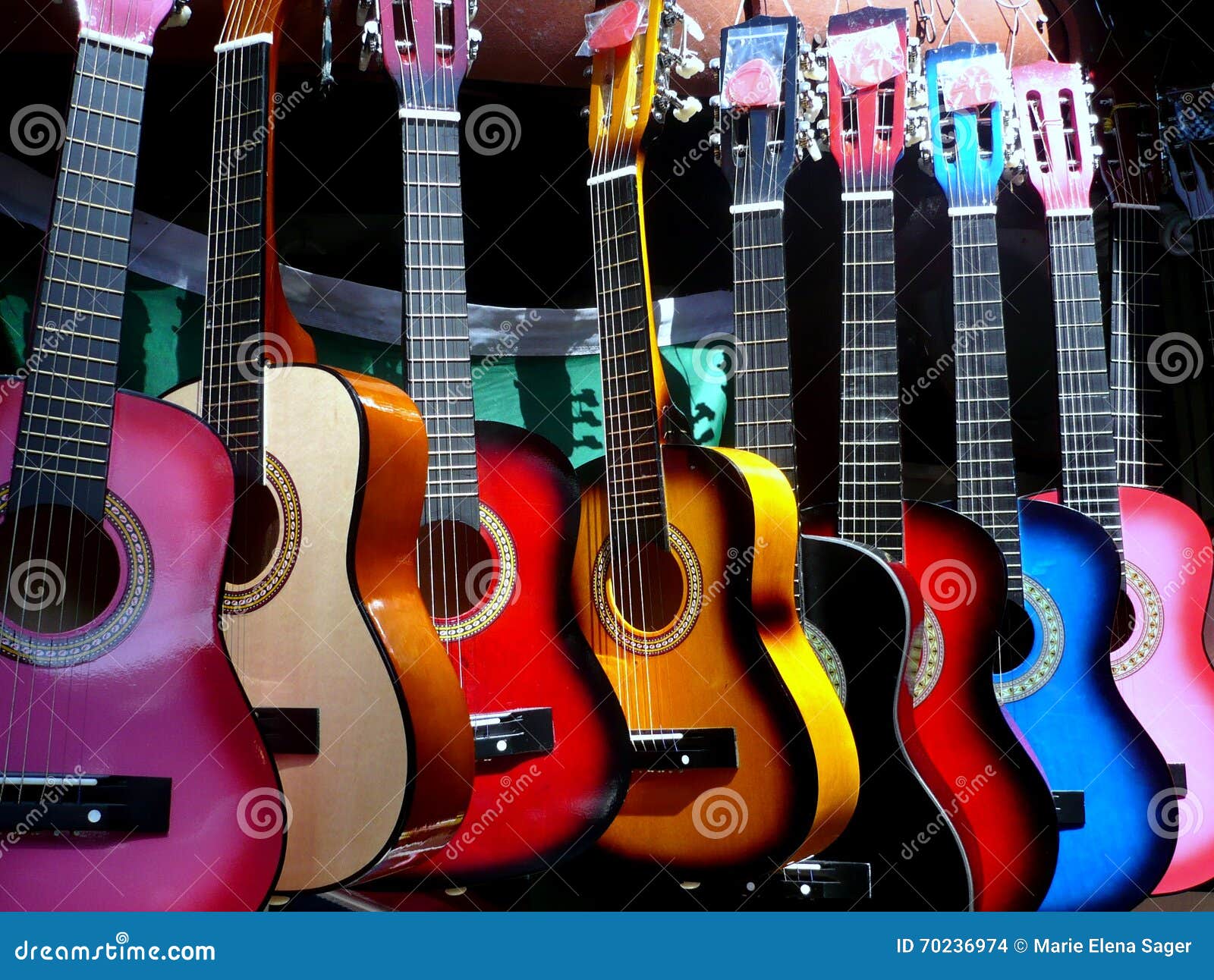Bunte Gitarren Laden Verschieden Gefarbt Viele Decke Gitarren Gehangen Akustisch Canstock