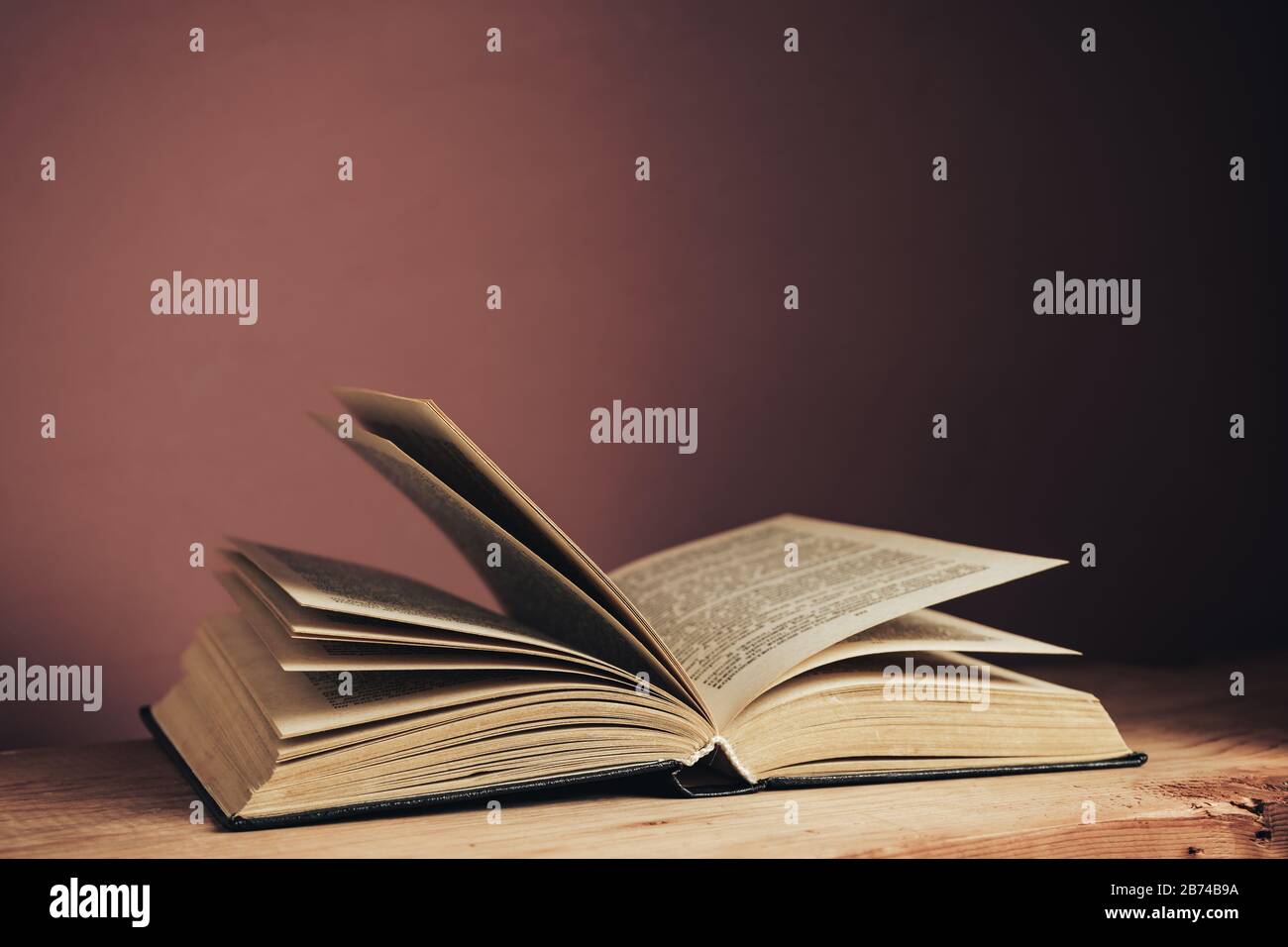 Wunderschones Offenes Altes Buch Musterhintergrund Fur Das Design Das Buch Auf Einem Roten Holztisch Und Rotem Wandhintergrund Stockfotografie Alamy
