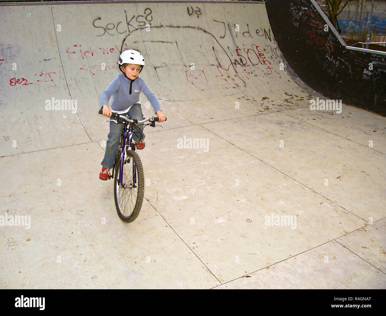 Joung Boy With His Mountainbike Trains Bmx Tricks In The Halfpipe Stock Photo Alamy