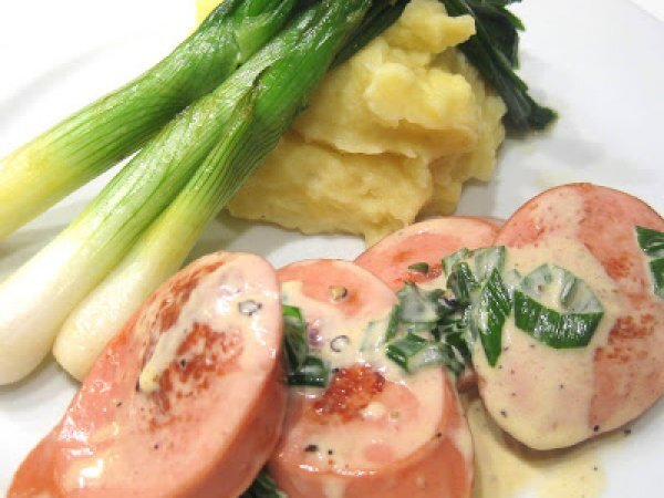Gebratene Fleischwurst Mit Kartoffelpuree Und Glasierten Fruhlingszwiebeln Heimatkuche Und Rheinhessische Gemutlichkeit Arthurs Tochter Kocht